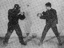 也有进行三次打击的复合攻击。例如,闪躲之后向对手身体猛击两拳,这一手一般会引起对手将防守注意力下移,从而暴露出空当。还有“安全的三次打击”,即第一次和最后一次的打击目标是一致的。例如,如果第一次拳打击的是身体,第二拳打击的是颚部,那么最后一拳还应该打击身体。 左手或右手的猛烈攻击,经常被用作反击的手段。先诱使对手主动进攻,当其上当后,你稍低头并迎上前去,让其右拳从你的左肩上方掠过,此时你要全力打出左拳,并同时猛扭左肩。眼睛应盯住对手的左手,如果他用左手反击,你应立即用右手阻挡。对付左手在前(左撇子)的对手,如下图所示:李小龙先以右手做假动作,接着李小龙迅速地用左直拳攻击对手的面部,如果对手以左手在前,李小龙就无需向纵深突破了。 |